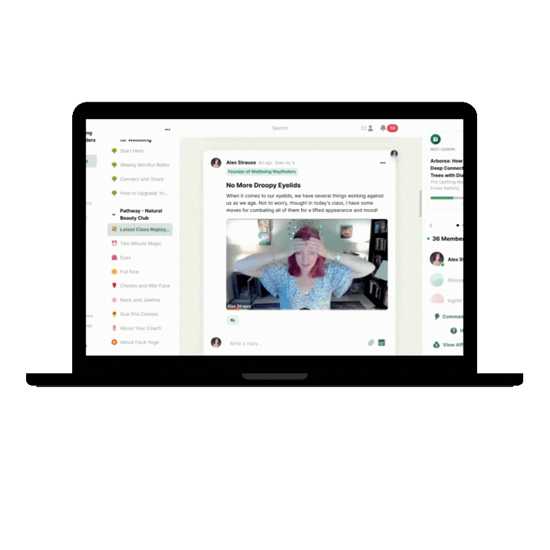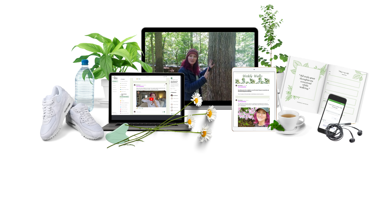 Weekly mindful walking practices, live face yoga classes, face yoga class library, seasonal celebration calls, printable walking journals & Community